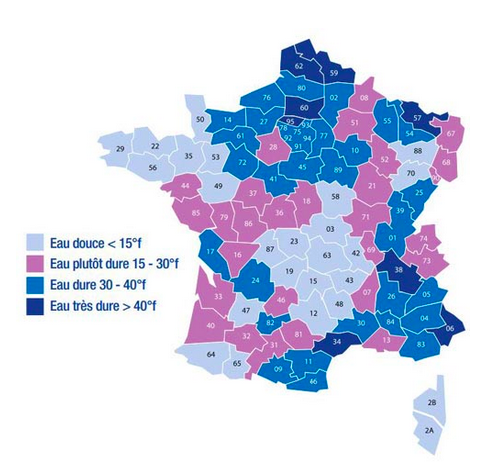 ——是因为水质!法国的整体水质还是属于比较硬的,以下是法国城市的水质软硬度分布图: