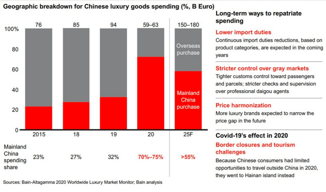 这一年,中国大陆的购买额达到了中国奢侈品总支出里70%至75%的高峰。虽然,对于整个市场来说,它们并没有弥补全球中国游客在奢侈品上的消费急剧下降35%;但是,自2015年以来,在降低关税、对黑市进行更严格的控制和房屋价格统一的鼓励下,这种奢侈品购买“回流”国内市场的现象已经在进行中。