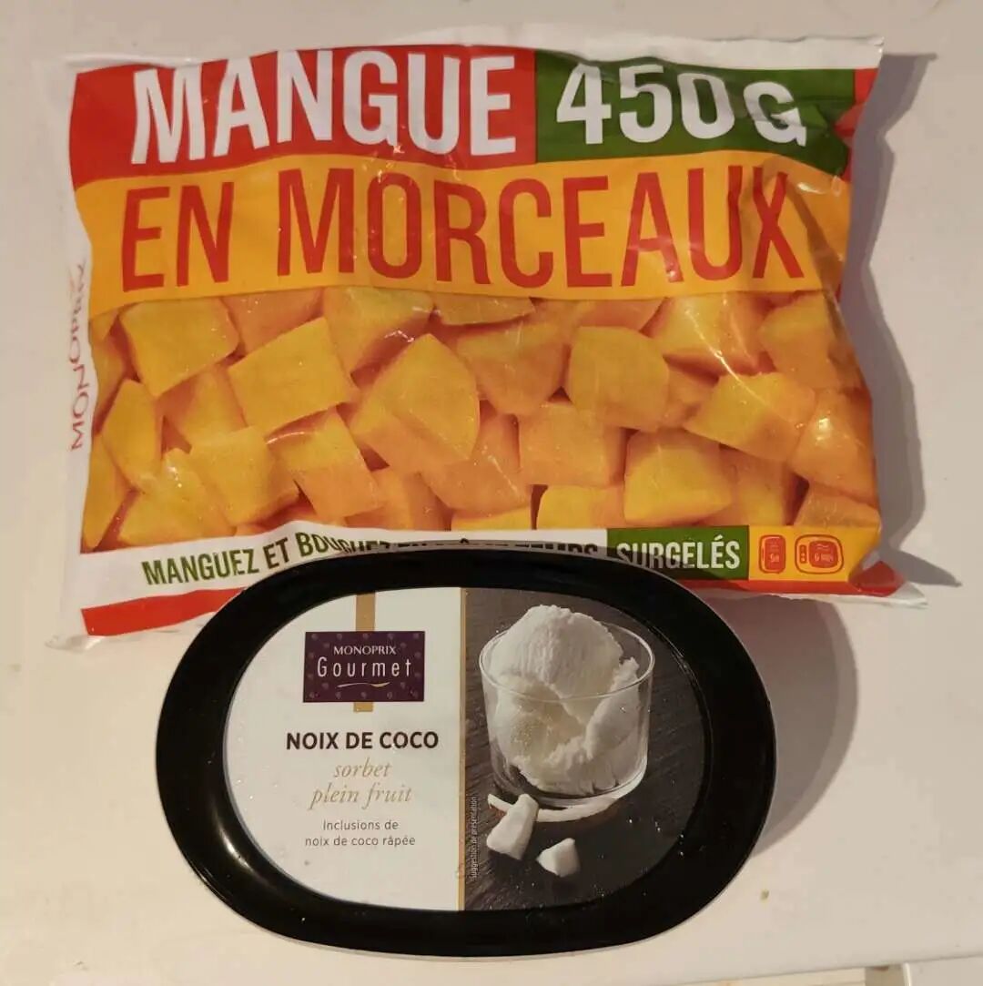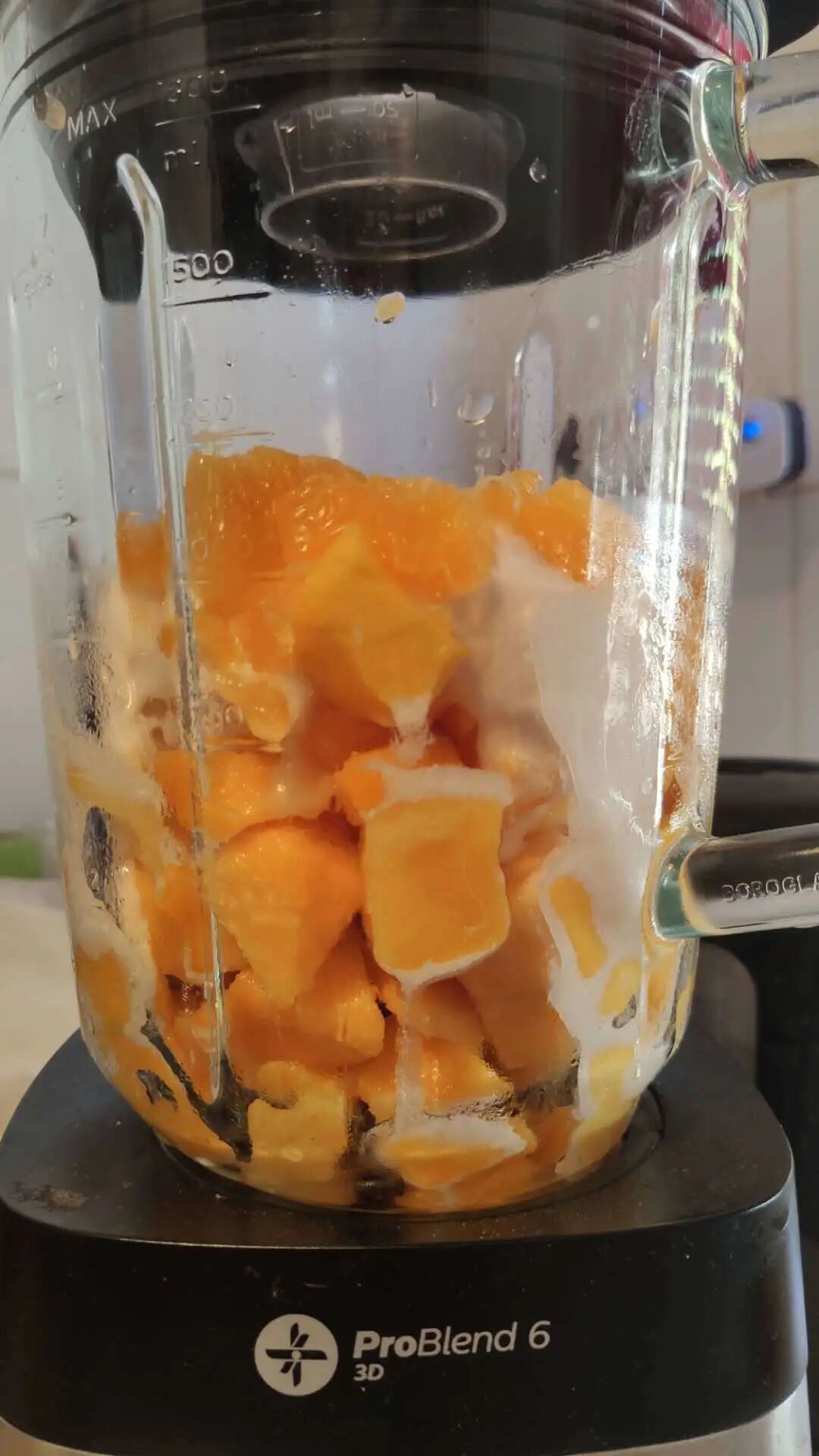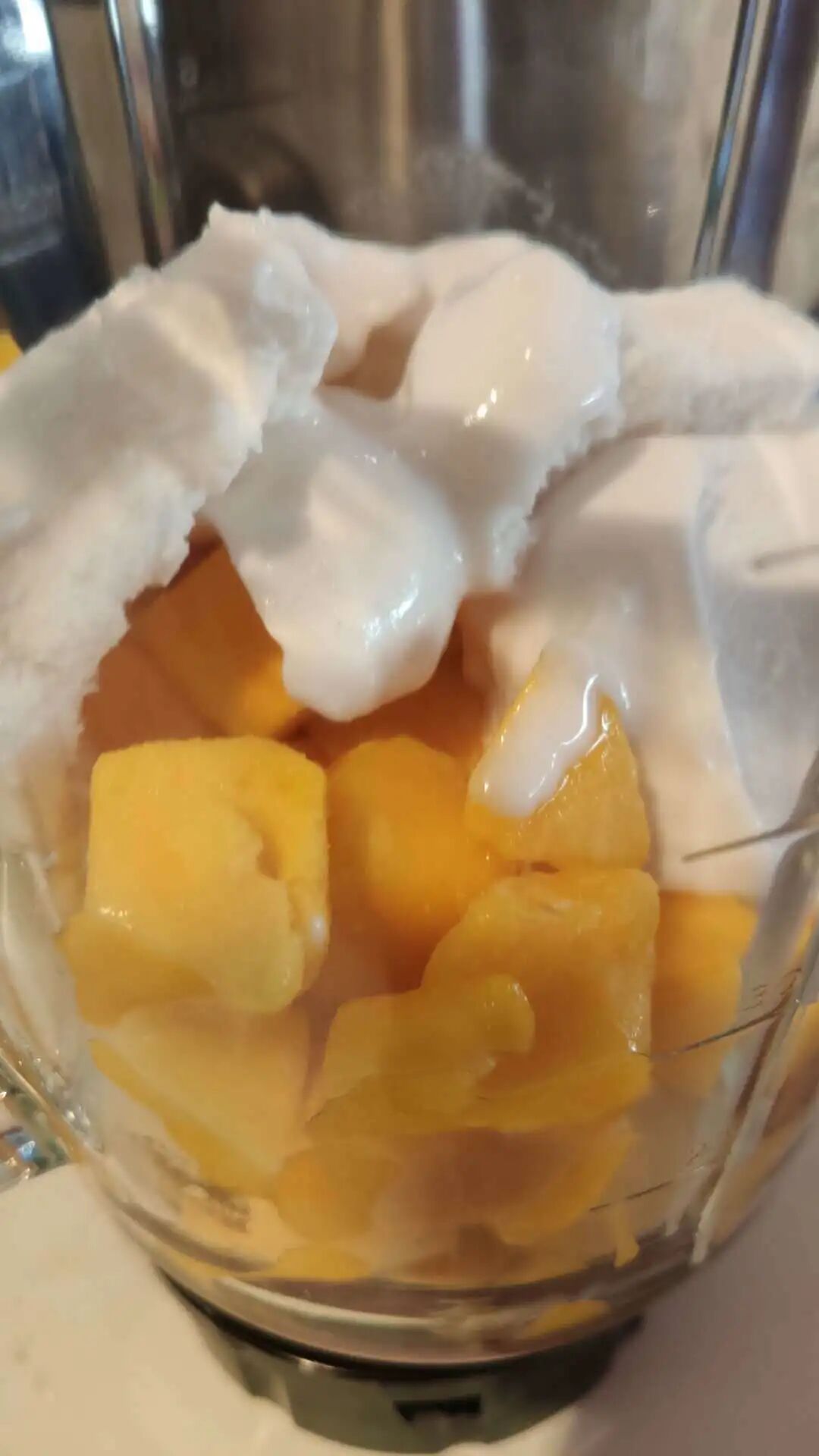 将一袋芒果块(450g)和半桶椰子冰激凌(250ml)放入榨汁机,静置一会儿等芒果解冻。记得要留出几块放在一旁备用。
