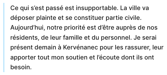 在11月3日周四举行的受害者家属、市长和民选官员一同出席的会议上,Lorient的市长Fabrice Loher表示将给予受害者和家属足够的支持,他说:“发生这样事情让人无法忍受......今天,最重要的是,我们与受害者、她的家人和工作人员在一起。我明天将专门去Kervénanec养老院(了解情况),让那里的老人们放心,给予他们所有的支持并倾听他们的需求。”