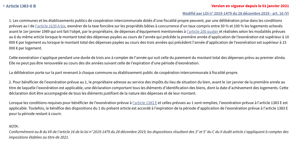 但是,事情好像没有那么简单。根据市政厅的说法,但还有其它条件,大家可以在《税法》第1383-0 B条(l’article 1383-0 B du Code général des impôts)中找到详细信息,网址如下:https://www.legifrance.gouv.fr/codes/article_lc/LEGIARTI000041579348。