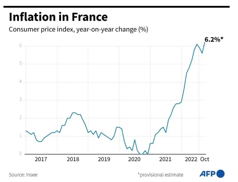 图源:2017到2022年法国的通货膨胀情况。(法新社图)