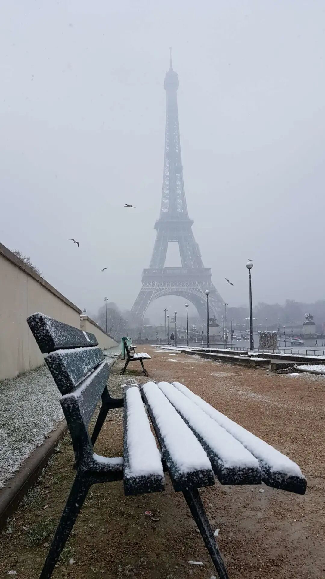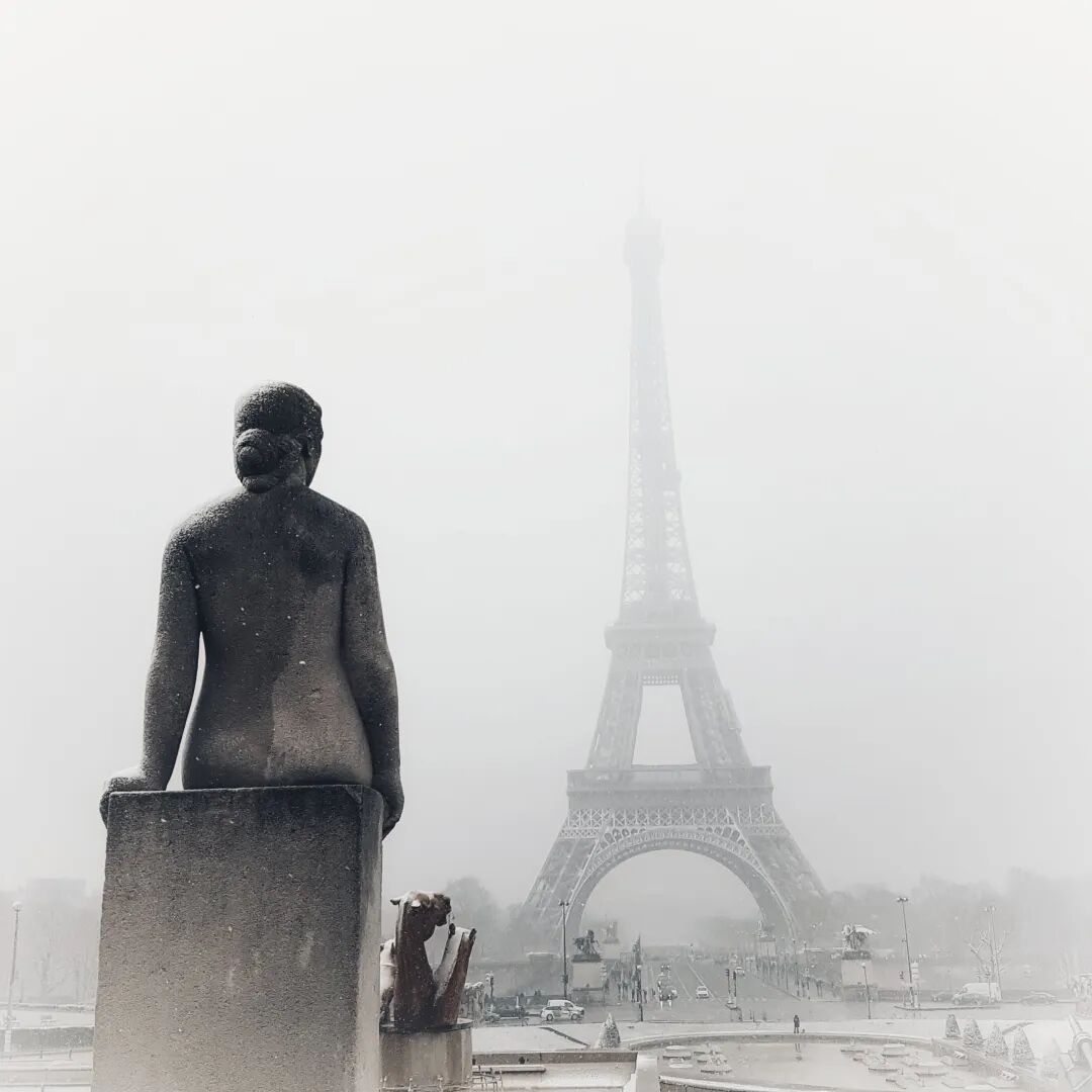 在雪雾之中,埃菲尔铁塔像是入了梦,被蒙上了一层神秘的面纱: