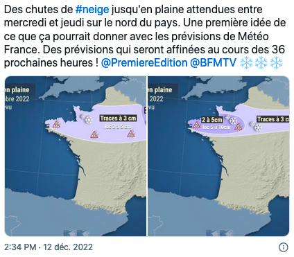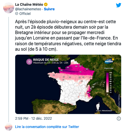 法国气象局12月12日的消息称:继昨晚中东地区的雨雪天气后,明天(12月13日周二)晚上将开始第二场雨雪天气,从布列塔尼内陆开始,周三将通过法兰西岛蔓延到洛林。由于温度低于零度,地上会有5到10厘米的积雪。