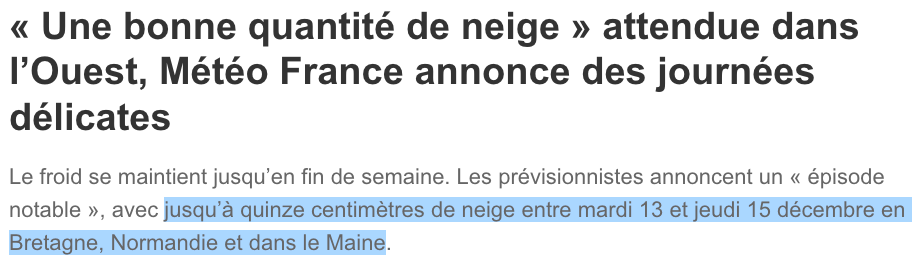 从全法来看,相对而言,最受这次降雪影响的是:12月13日周二至12月15日周四期间,布列塔尼、诺曼底和缅因州的降雪量预计将高达15厘米。