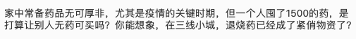 在这样的情况下,国内治疗感冒、发烧的药品短缺严重,有些人表示很愤怒——大家疯狂“抢药”甚至“囤药”的行为,导致三线小城的退烧药都快被抢没了!你让真正需要用药的人怎么办?