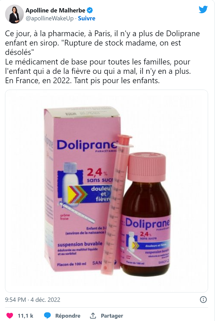 这位42岁的记者对目前的状况非常不满:“今天,在药房,在巴黎,你找不到给孩子的糖浆多利潘(扑热息痛)了。所有家庭的基本药物,已经没有了,对于发烧或疼痛的孩子来说这种情况更是火上浇油。在法国,2022 年,对孩子来说太糟糕了,”她说。