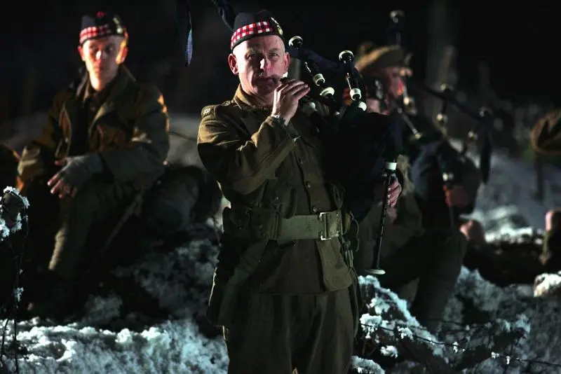 在此之中,就有刚刚入伍的德国人斯普林克。在圣诞之夜,斯普林克的女友安娜来到营地看望他。同为歌唱家的两个人,在寒风中唱起了圣诞颂歌。而曾为苏格兰的牧师也在此吹响了风笛。寂静寒夜中,天籁般的歌声与空灵的苏格兰风笛在战场上飘荡,也温暖着这个战场上的士兵们。