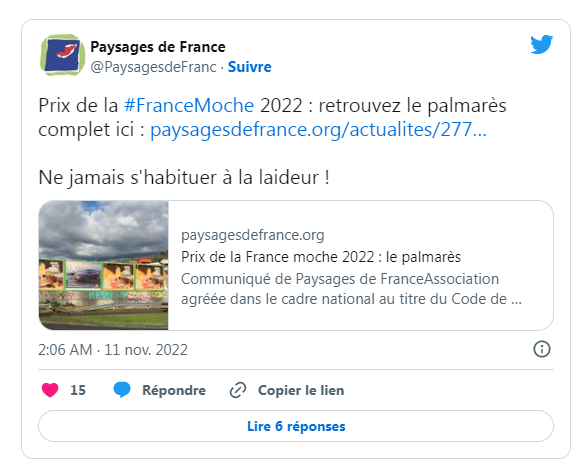 Paysages de France该协会一直强调自己举办这个评比的理念“不是为了污名化法国的城市,”它们只是想 “可以简单地纠正扭曲这些日常景观的因素”。