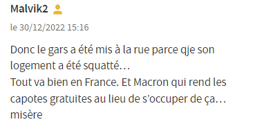 “所以这家伙被赶出去了,因为他家被人霸占了...在法国一切都很好。马克龙可以向大家提供免费的安全套,却不能照顾那个……可怜人。”