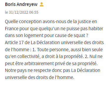 “我们法国人的正义观念是什么,以至于有人因为被霸占房屋而不能住进自己的家?《世界人权宣言》第17条:1.每个人,无论是独立的还是集体的,都拥有财产的所有权。2. 任何人的财产不得被任意剥夺。可见,法国不尊重《世界人权宣言》。”