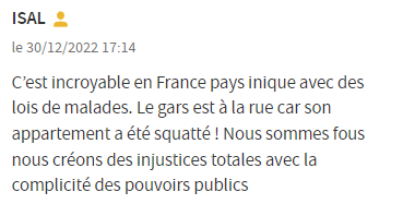 “这在法国是不可思议的,一个罪恶的国家,有病态般的法律。这家伙流落街头,因为他的公寓被占了!真是疯了,我们成为当局的同谋,制造了绝对的不公平。”