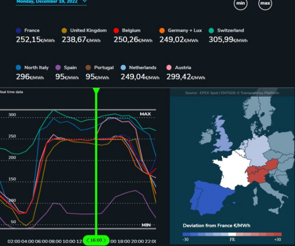 12月19日,在能源批发市场上,瑞士、意大利北部或奥地利的电价才是最高的。