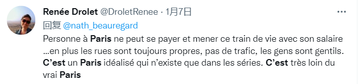 “在巴黎,没有人能靠自己的工资过上这种生活方式……此外,街道总是干净的,没有交通拥堵,人们都很友善。这是一个理想化的巴黎,只存在于‘艾米丽在巴黎’系列中。它离真正的巴黎很远。”