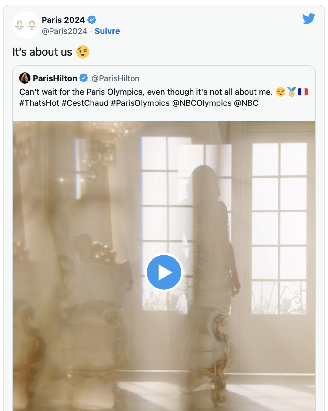 巴黎2024年奥运会开幕前558天,美国广播公司UBC的体育栏目发布了第一条预告短片。短片中邀请了初代网红,希尔顿继承人,同时也是歌手,模特,演员多重身份的帕丽斯 · 希尔顿 (Paris Hilton)。