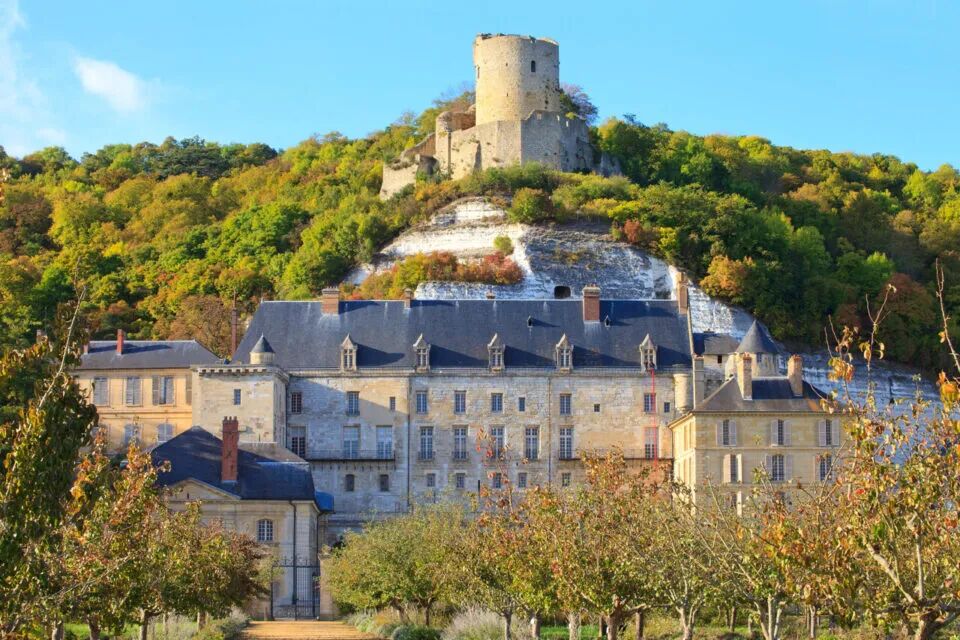 Perché sur une falaise de craie, le donjon de La Roche-Guyon domine la Seine.