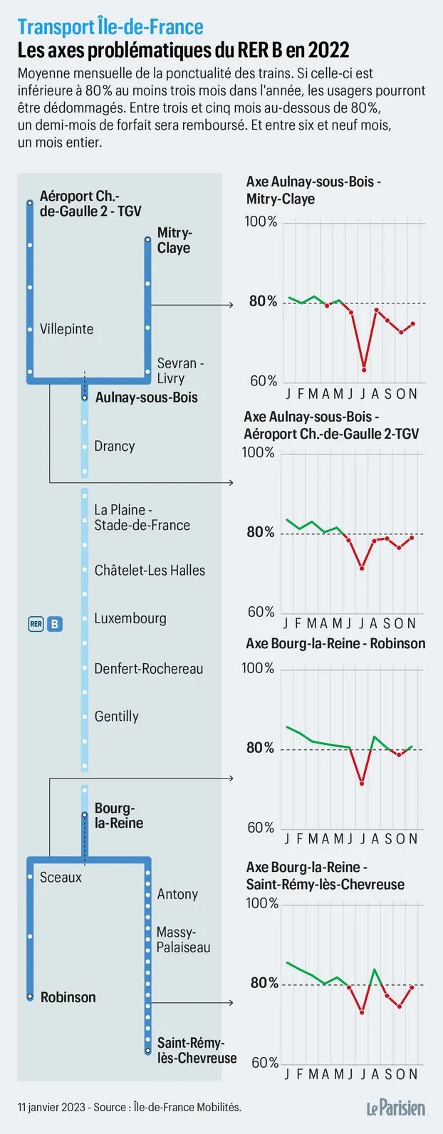 在RER B北线(Aulnay - Mitry)、RER B北线(Aulnay - CDG2)和RER B南线(Saint-Rémy - Bourg-la-Reine)线路上:如果您在准点率低于80%的月份中持有6个月的通票,您将获得一个月通票的补偿(最多75.20欧元)。如果你在3到5个月的月票中,准时率低于80%,你将被退还半个月的月票(最多37.6欧元)。