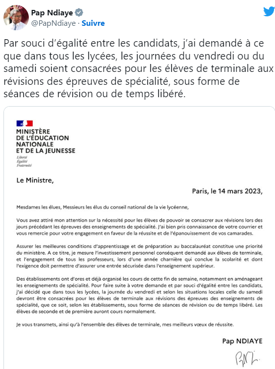 为了公平,法国教育部长恩迪亚耶(Pap Ndiaye)下达硬性要求——所有高中毕业班学生在考试前的周五(3月17日)和周六(3月18日)都要用于复习所考科目内容。