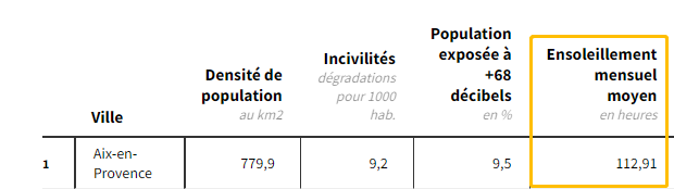 让艾克斯-普罗旺斯脱颖而出的指标是月平均日照时长。充足的阳光可以帮助合成维生素D,对人体健康大有好处,且让人心情愉快。