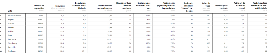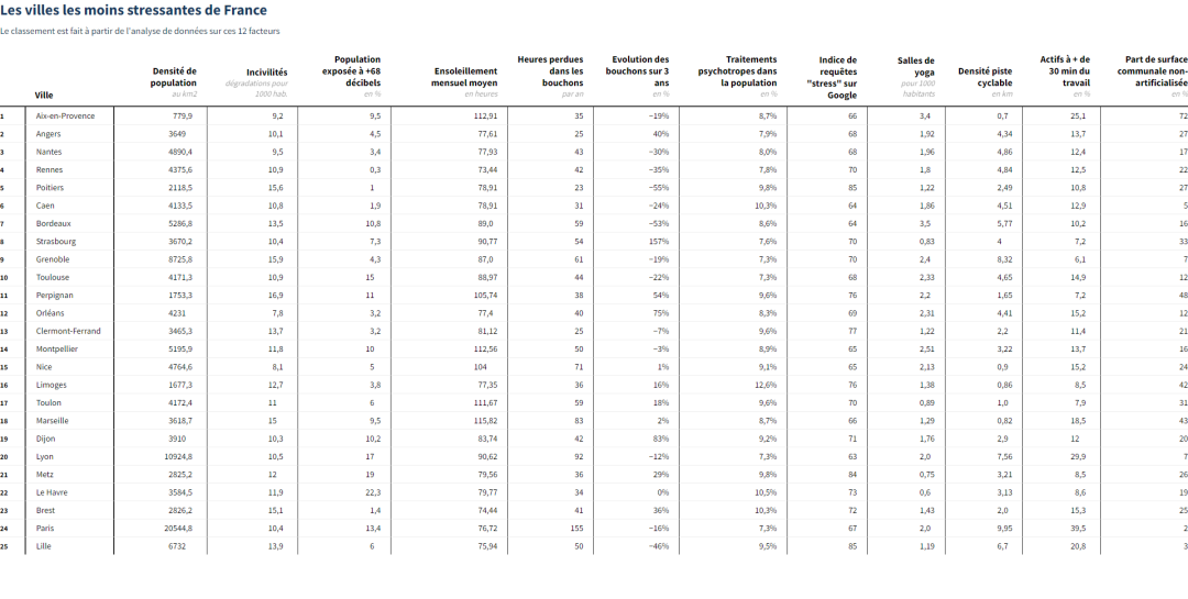 有意思的是,在评定中,“互联网上搜索‘压力大’这一关键词的次数”、“光照时数”、“自行车道密度”、“瑜伽房数量”、“服用精神药物的数量”等隐性指标也加入了评定标准中。在十二项指标的加持下,该排行榜对法国25个主要城市进行了评判。