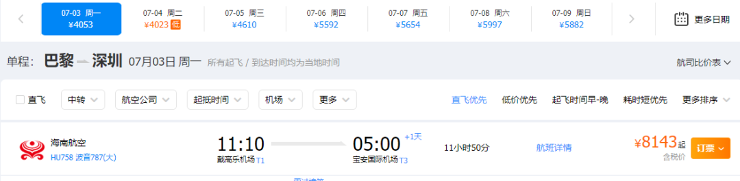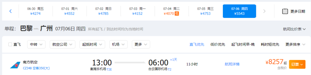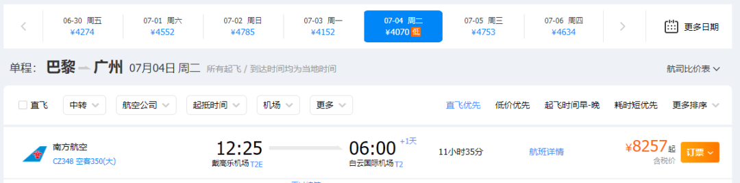 巴黎-广州(包括转机)的票价则是三个城市中最低的,2800+人民币(单程)。