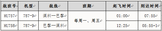 海南航空深圳—巴黎往返航线计划将每周执行2班往返,班期为每周一、周五。