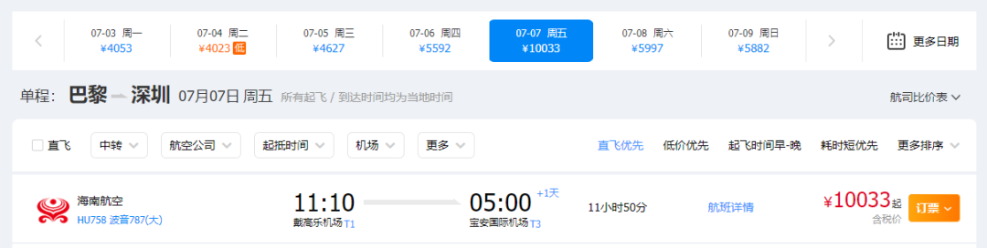 巴黎-北京(包括转机)的航班价格最低低至三千出头人民币(单程)。