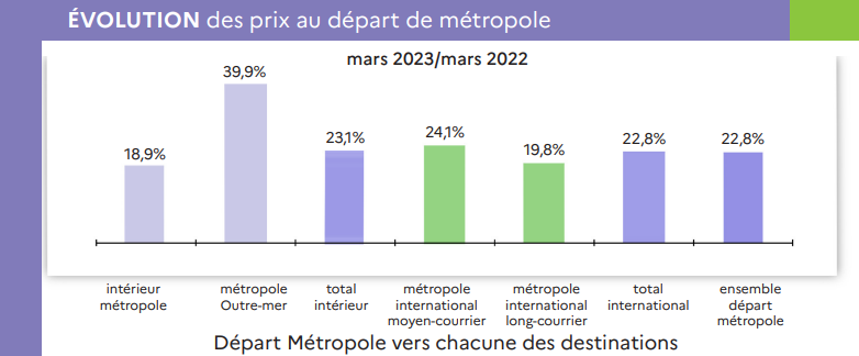 近期,从法国本土出发飞往海外海岛的航班价格飙升,尤其是马提尼克、瓜德罗普等安的列斯群岛,无论航空公司和旅行等级如何,2023年3月相对去年涨幅达39.9%。而从海外海岛出发的涨幅也高达36.2%,其中马提尼克和瓜德罗普所占比重最大。今年头三个月,航班价格累计上涨达23.6%。