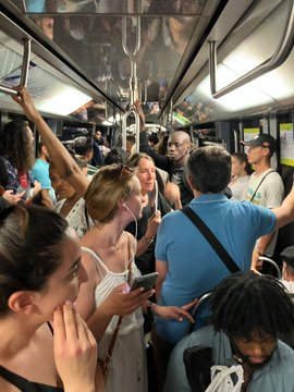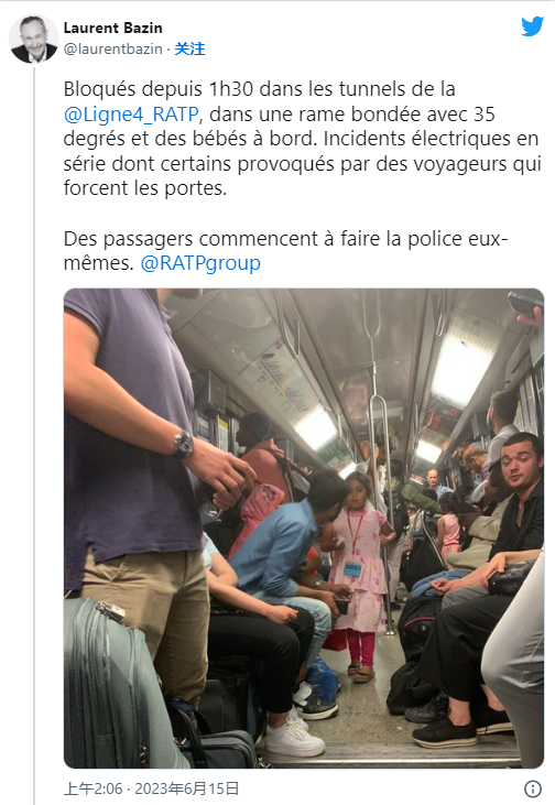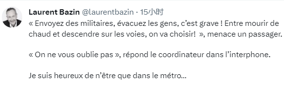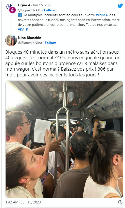 “在 40 度以下不通风的地铁里被困 40 分钟,这正常吗?当我们按下紧急按钮时,周围人在大喊大叫,因为车厢里已经出现3次乘客身体不适的情况,这正常吗?巴黎地铁究竟在高贵什么?每月收费80欧,还天天出事故!”