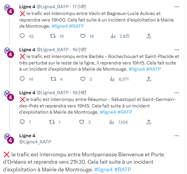 14日(星期三)晚上19点23分,巴黎地铁4号线发生严重瘫痪。据悉,这次地铁故障最早发生在蒙鲁日市政厅站(Mairie de Montrouge)。按照官方解释,故障原因是“地铁列车的电力系统突然中断”。