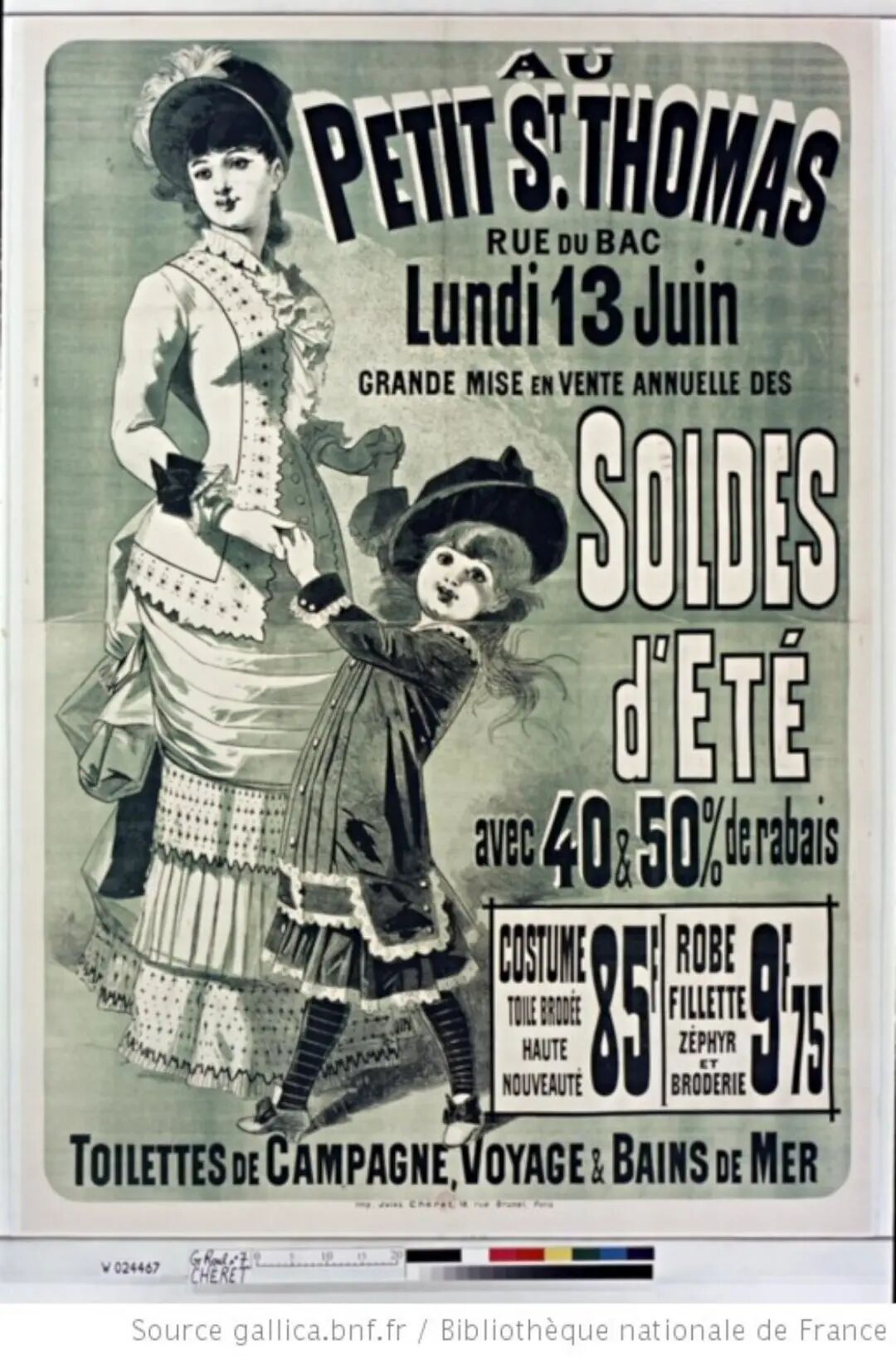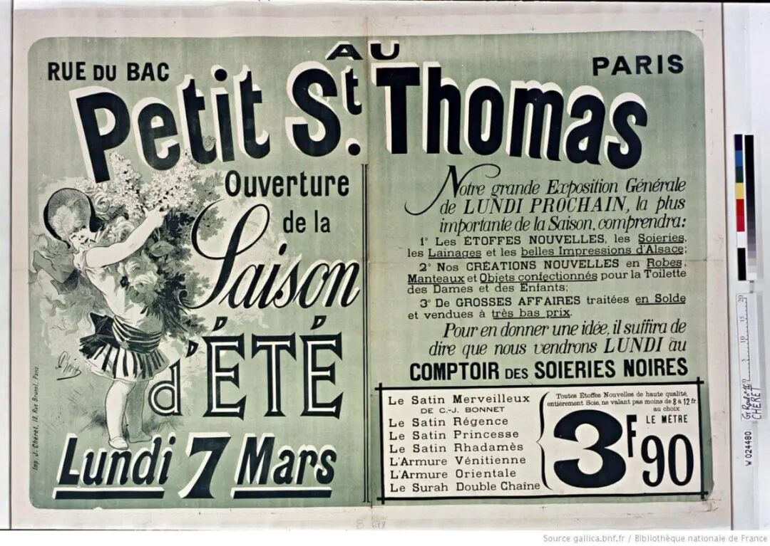 在巴克街的小圣托马斯 (Petit Saint-Thomas),夏季促销有 40%和50%的折扣……海报由 Jules Chéret(1836-1932 年)绘制。