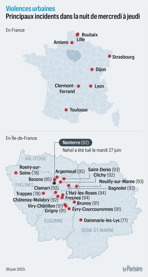 https://www.leparisien.fr/faits-divers/mort-de-nahel-17-ans-tue-par-un-policier-comment-ligpn-enquete-sur-les-soupcons-de-bavures-policieres-28-06-2023-QQPRZ6IHWVG73JJ2PMKZKD6LVA.phphttps://www.ouest-france.fr/ile-de-france/nanterre-92000/en-images-jeune-tue-a-nanterre-nuit-de-violences-urbaines-notamment-en-banlieue-parisienne-0ce392db-96a5-4b3b-9783-aae8c897b02e