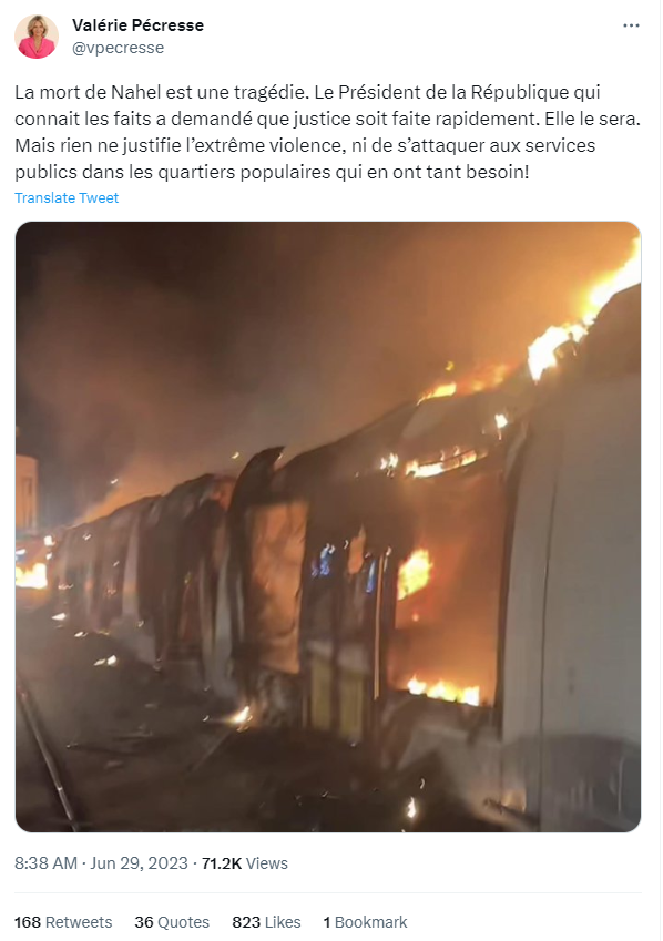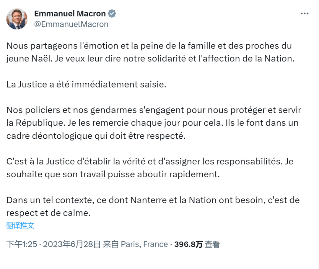 纳赫尔的死亡是一场悲剧。了解事实的共和国总统已经要求尽快伸张正义。这将会得到解决。但是,我们没有理由使用极端的暴力,也没有理由在非常需要公共服务的工人阶级居住区攻击公共服务!
