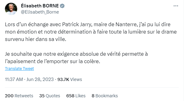 在与南泰尔市市长帕特里克·贾里进行交流时,我向他表达了我的悲痛之情以及我们要全面调查昨天在这个城市发生的悲剧的决心。