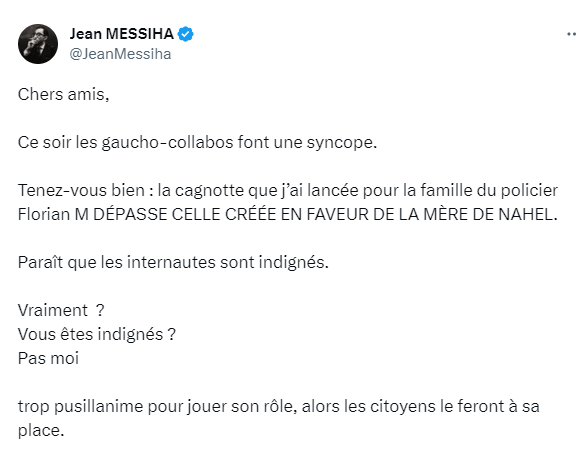 极左翼政党“不屈法国”议员托马斯·波特斯(Thomas Portes)也表达了同样的愤慨:“右翼分子在网上开了一个‘锅’,支持杀害纳赫尔的警察,警方甚至在社交网络上转发了这一消息。100万欧元支持一名杀害儿童的男子,真令人作呕 。”