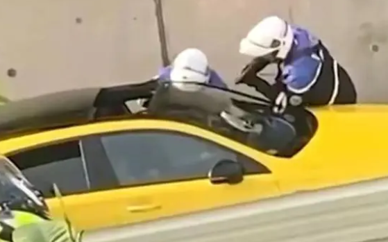图为警察拿枪指着司机。
