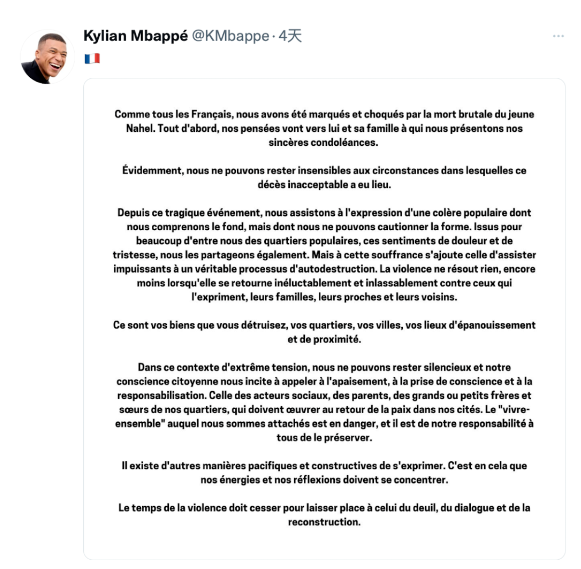 姆巴佩30日再发推文。图源:推特截图