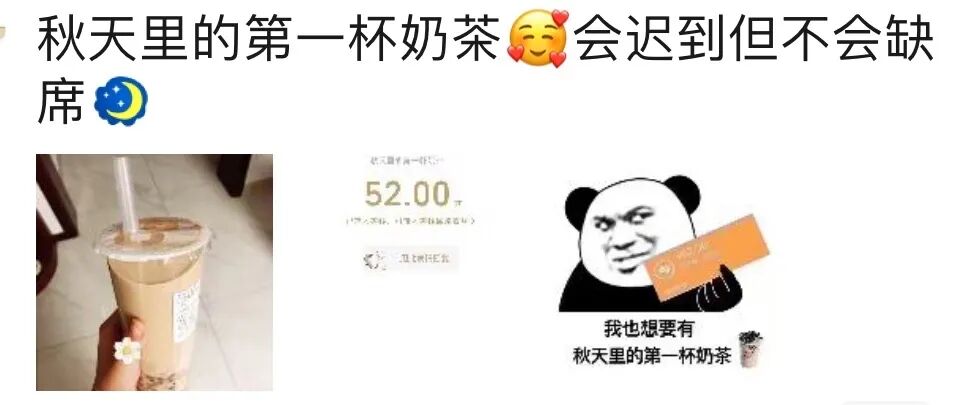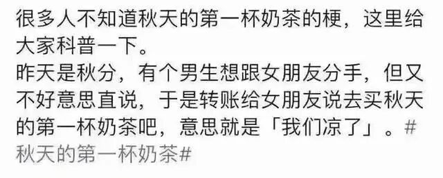 小编看了一下,最有道理的解释就是天凉,大家闲来无事借秋天季节的到来,要第一杯奶茶和红包秀恩爱或者秀感情。