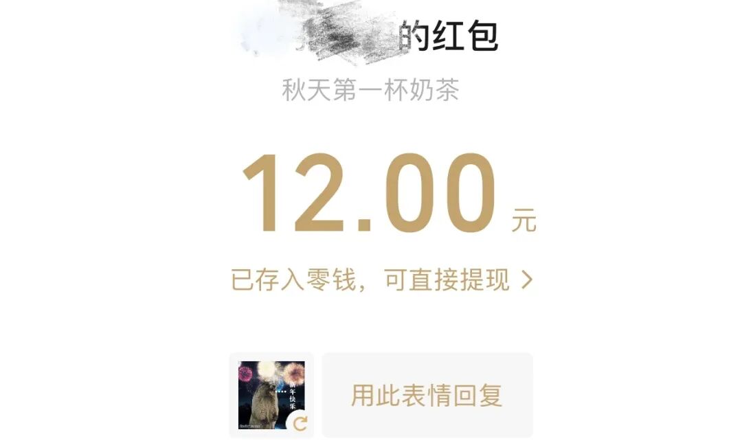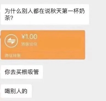 有一种鸡皮疙瘩掉一地的“小确幸”说法:“在这个冷冷的秋天,有一杯热乎的奶茶心里特别温暖。就是在意你的人,看到你发的消息,或者主动发你52元的奶茶钱,让你能喝到秋天的第一杯奶茶!”
