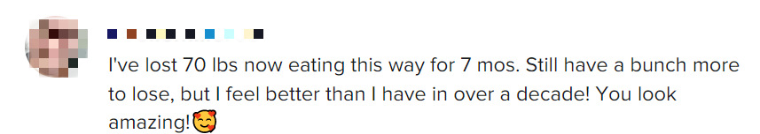 “我按照你的食谱这样吃了7个月,已经减掉了70磅。还有很大的进步空间,但我感觉现在的状态比过去十几年的任何时候都要好!你太棒了!”