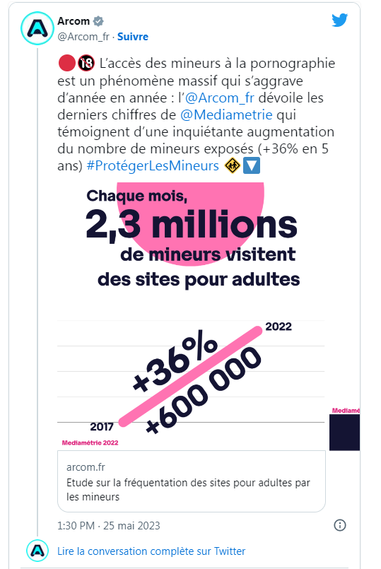 这些“可怕的数字”瞬间得到法国政府的关注,并意识到采取行动的紧迫性。5 月 10 日,政府提出了一项旨在“保护和规范”互联网的法案,该法案赋予 Arcom 阻止和删除不符合法律规定的色情网站的权力。