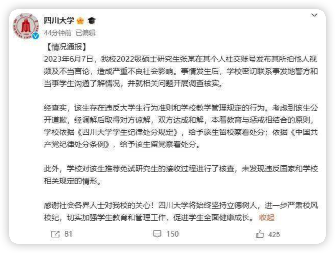 说到“造谣”不禁让小编不禁想起了前段时间在国内发生的川大女研究生“地铁偷拍”事件。似乎性质更加恶劣,但是惩罚却要轻很多……