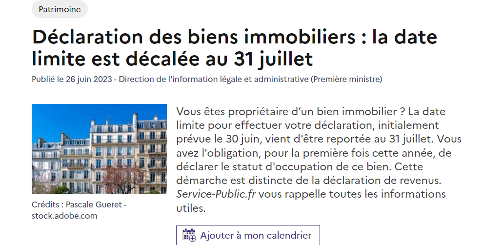 需要注意的是,这个申报过程与纳税申报表是分开填写的。如果大家不清楚具体步骤,可以在法国公共服务网站获取想要了解的所有基本信息。https://www.service-public.fr/particuliers/actualites/A16511