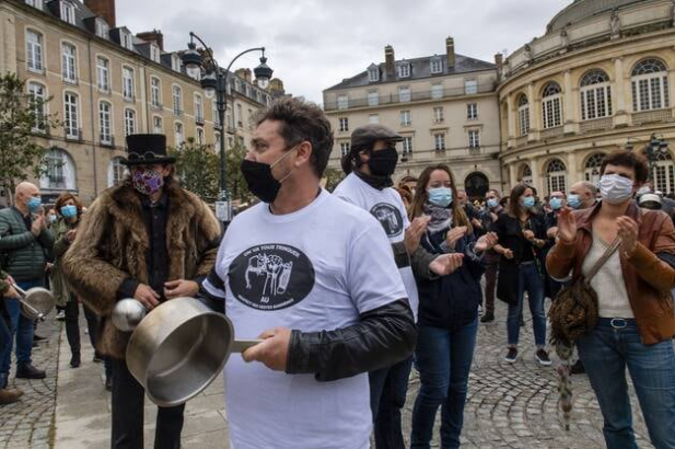 9月30日下午,雷恩市300多名餐饮业者聚集在市政厅前,敲打锅碗瓢盆,抗议当地政府强制在22H前关闭酒吧。理由是“就算人们不来酒吧,他们也会去别的地方嗨”。这一场游行也被媒体戏称为“铁锅演奏会”。“我们早就已经入不敷出了,如果这项政策继续下去,很快很多酒吧都会倒闭。”一家夜店的老板这样说道。
