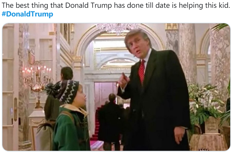 (图片是《小鬼当家》的截图,特朗普曾经在这部喜剧电影中短暂出镜,帮男主角指路。)