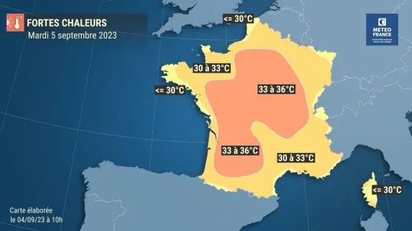 9月5日周二,热浪将继续席卷全国,阳光依然覆盖整个法国。与前一天相比,南西部的温度可能在局部地区下降2到3摄氏度,但仍然保持在异常高的水平(超过35摄氏度)。