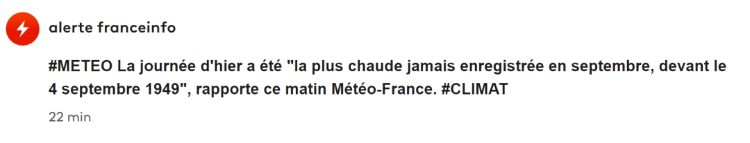 法国气象局写道:“这一天,法国平均气温为25.1°C,2023年9月4日星期一将成为9月份最热的一天,打破了1949年9月4日创下的24.7°C 的纪录。”