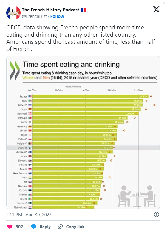 根据OECD的数据,法国人平均每天花费2小时11分钟的饮食时间,这还不包括准备饭菜或购买食物所花费的时间,这些时间被归类为“无偿工作”类别下的“日常工作”。