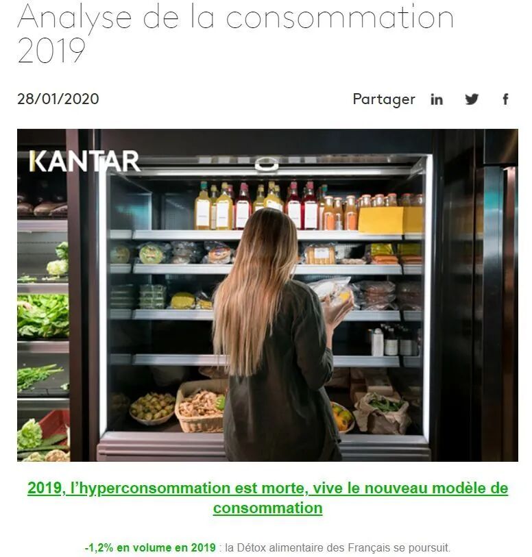 在法国,人们的消费习惯一直在改变。在市场分析咨询公司 Kantar(凯度) 通过对近三年(2016-2019)法国消费数据的分析,发现法国消费市场已经由“过度消费”转向“去消费”模式。其中,2018年被认为是“法国过度消费的终结年,也是新消费模式的转折点。”主要表现在:消费者更加注重消费品的质量,刻意减少消费品的数量,从而让自己的消费行为看起来更加“可持续”。