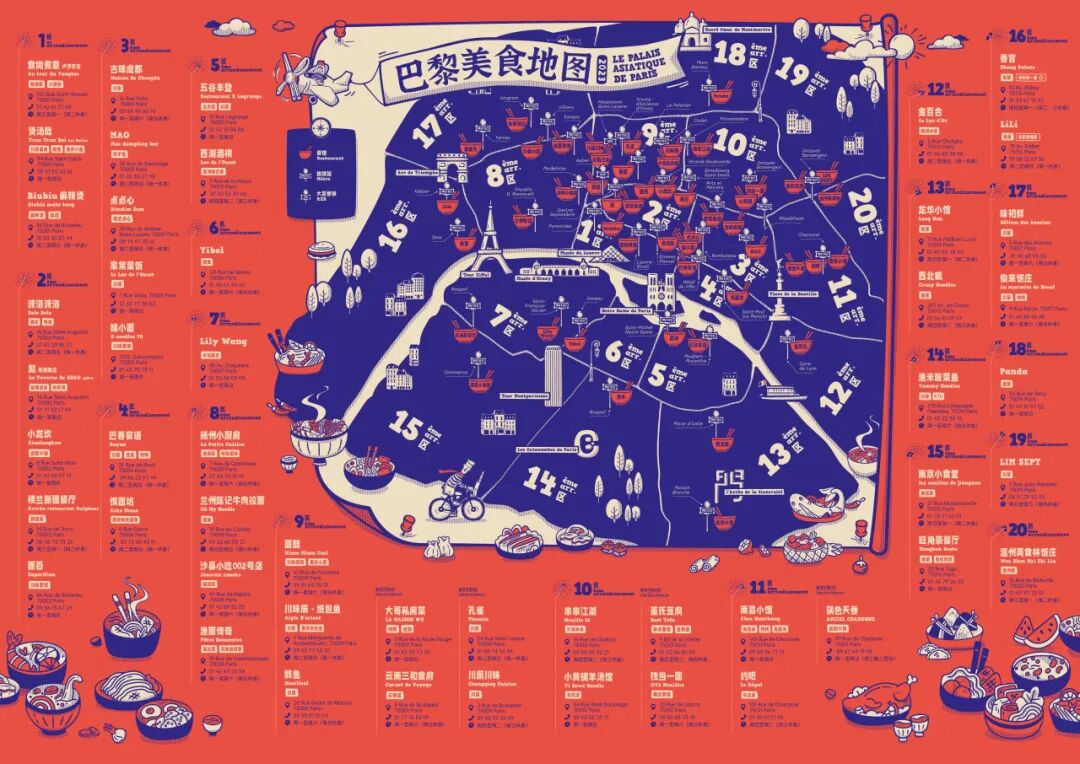 「2023巴黎美食地图」依据各大社交媒体平台的数据分析,并结合美食专家团队的意见,为大家推选出50家巴黎地区优质中餐厅,并依据餐厅地理位置精心制作了本年度巴黎美食地图,方便大家探店收藏!